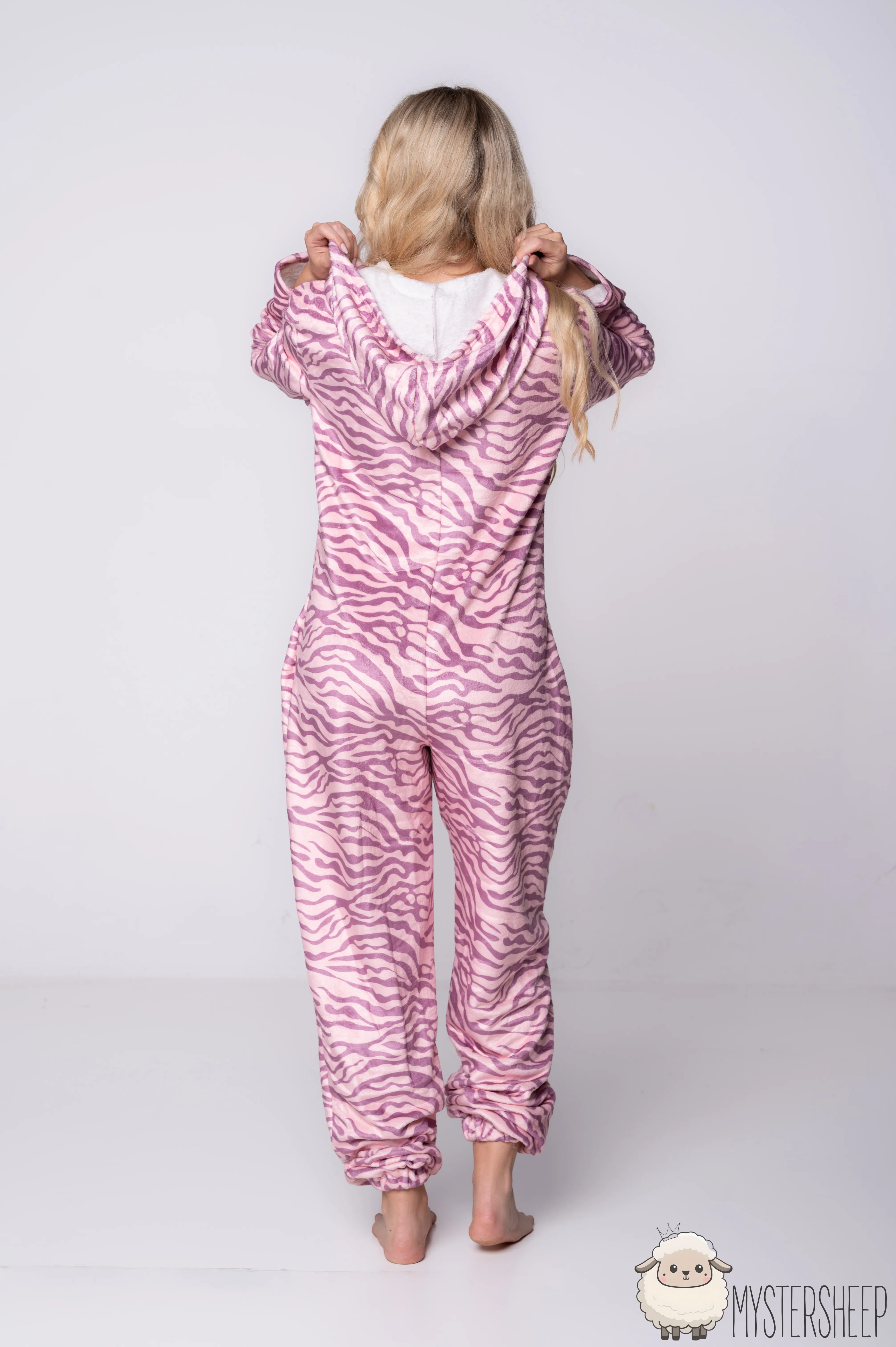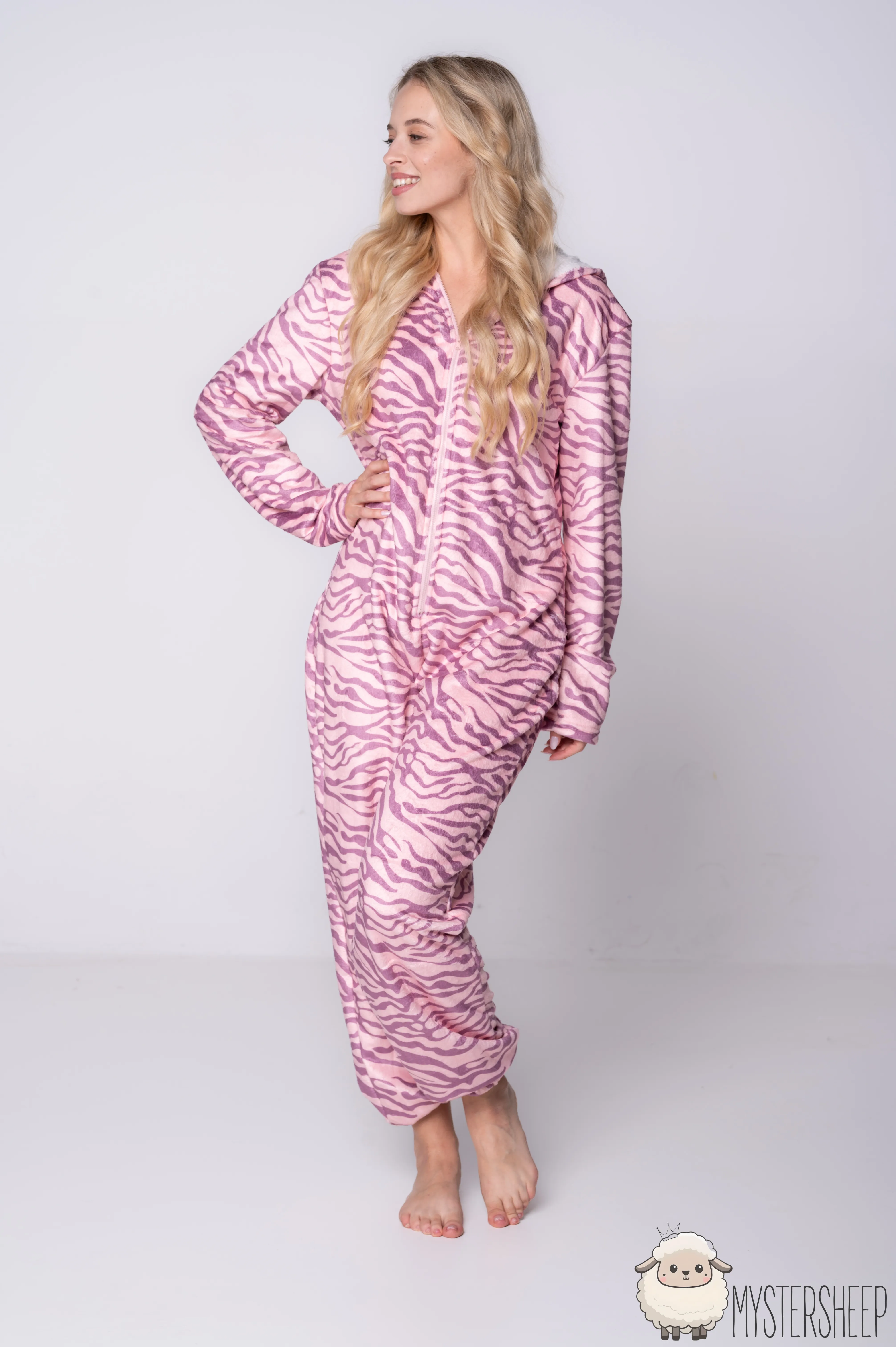 Wyróżnij się w tym wyjątkowym onesie. Różowe, w zwierzęcy wzór tygryska! Ciepła i miękka piżama jednoczęściowa sprawdzi się idealnie zarówno do spania, jak i wieczornego leniuchowania. Luźny krój i zamek z przodu zapewniają pełną wygodę. Stylowe i odważne kigurumi - dla tych, którzy lubią komfort z pazurem!