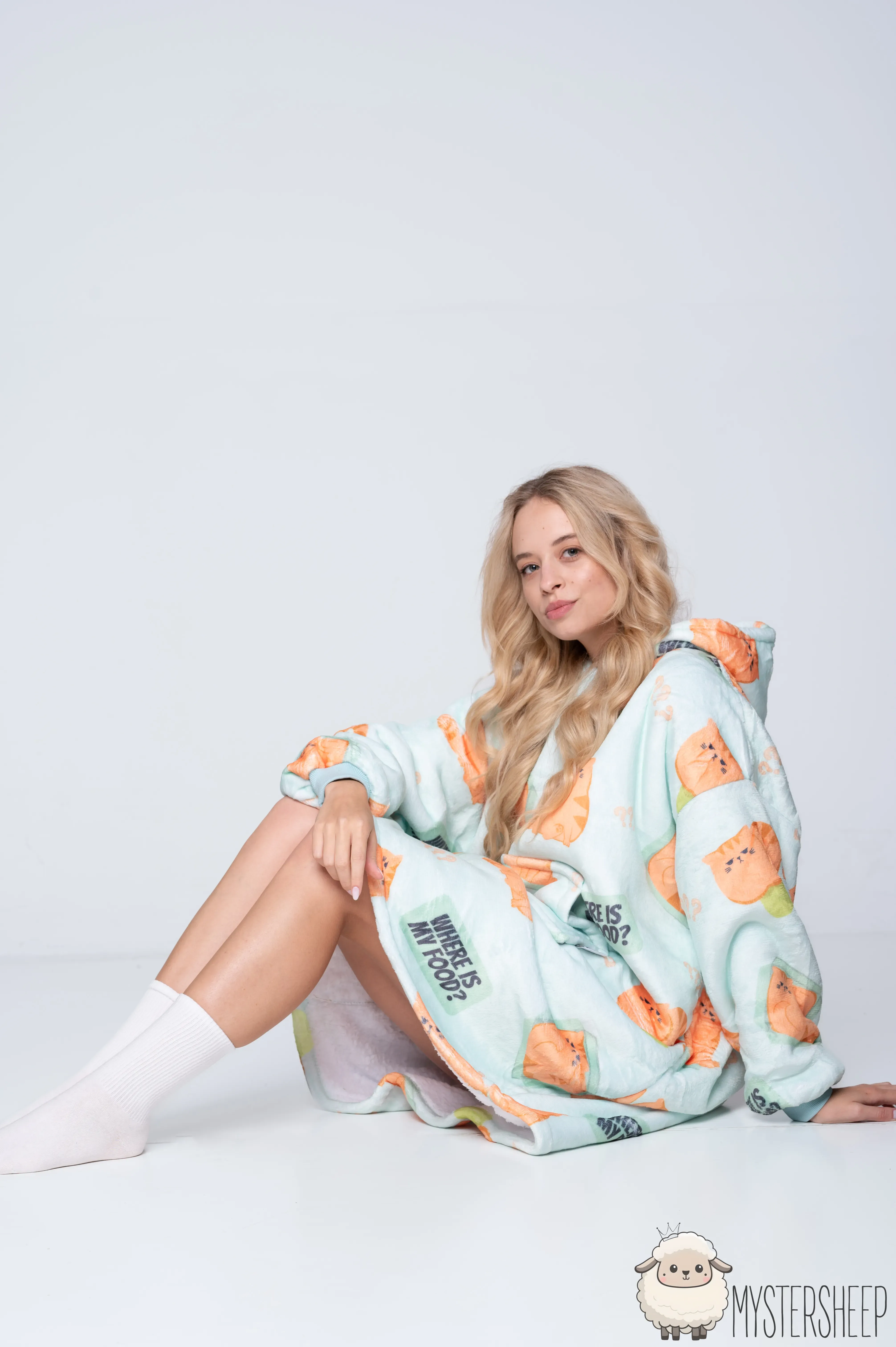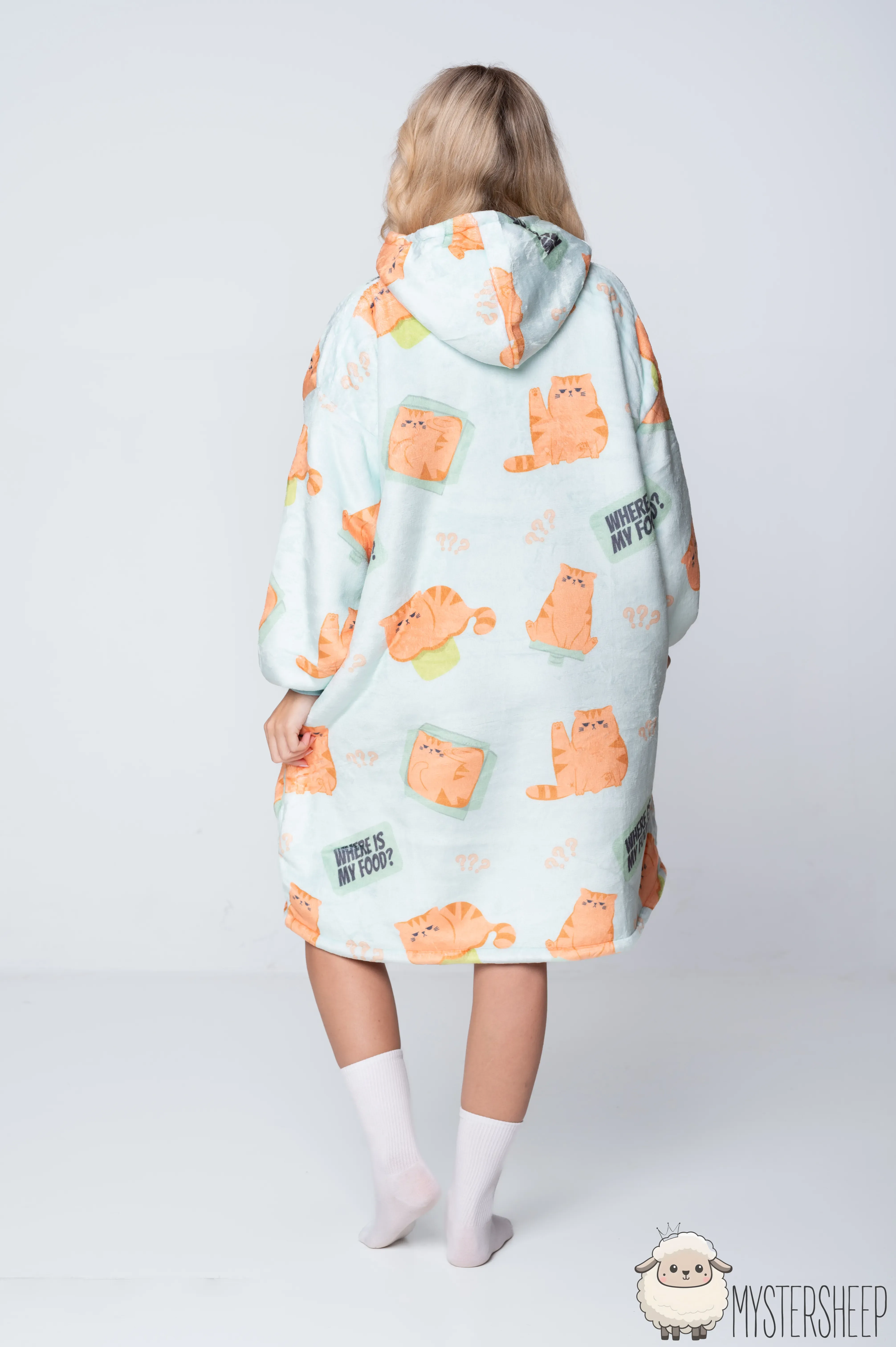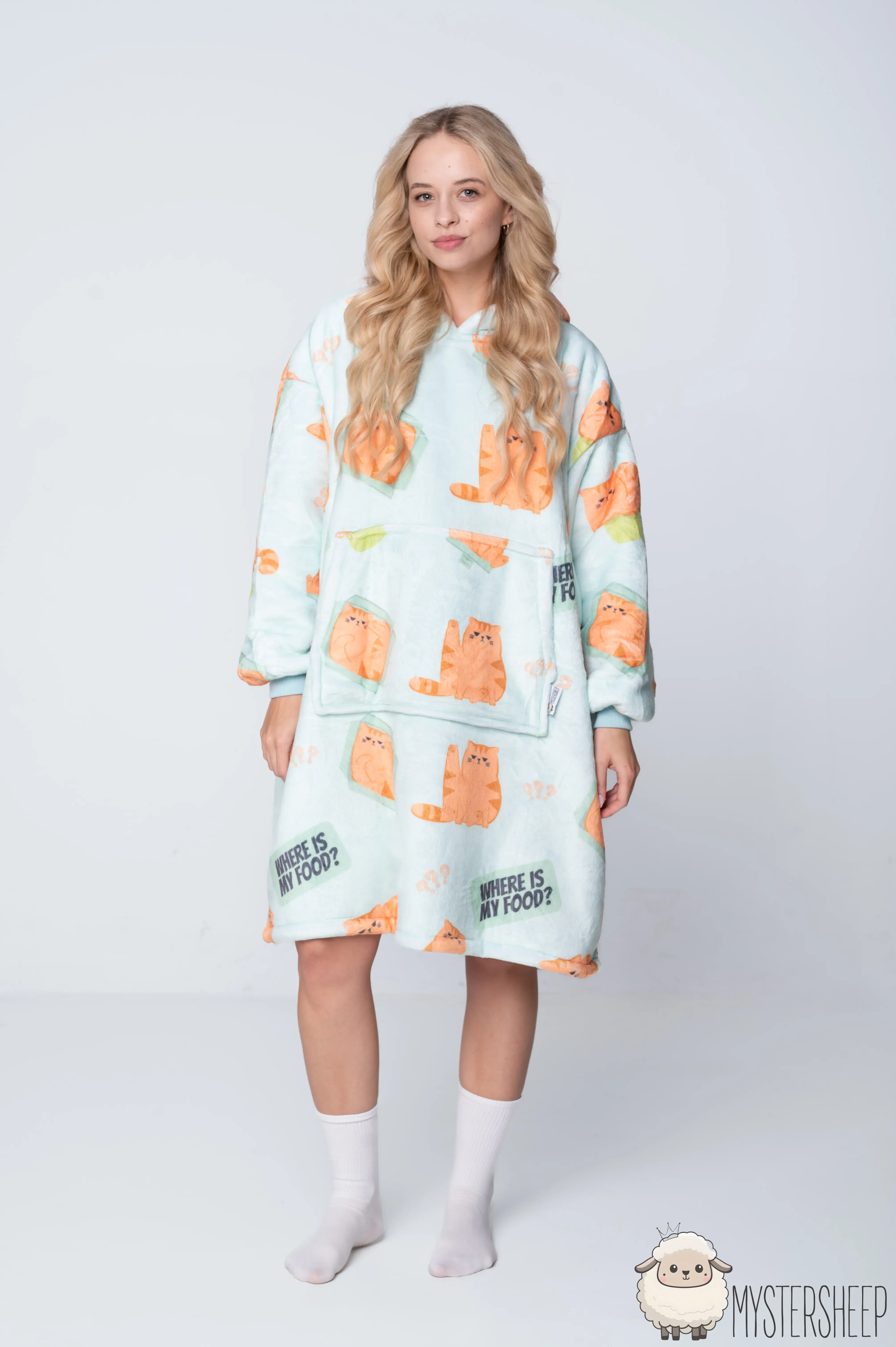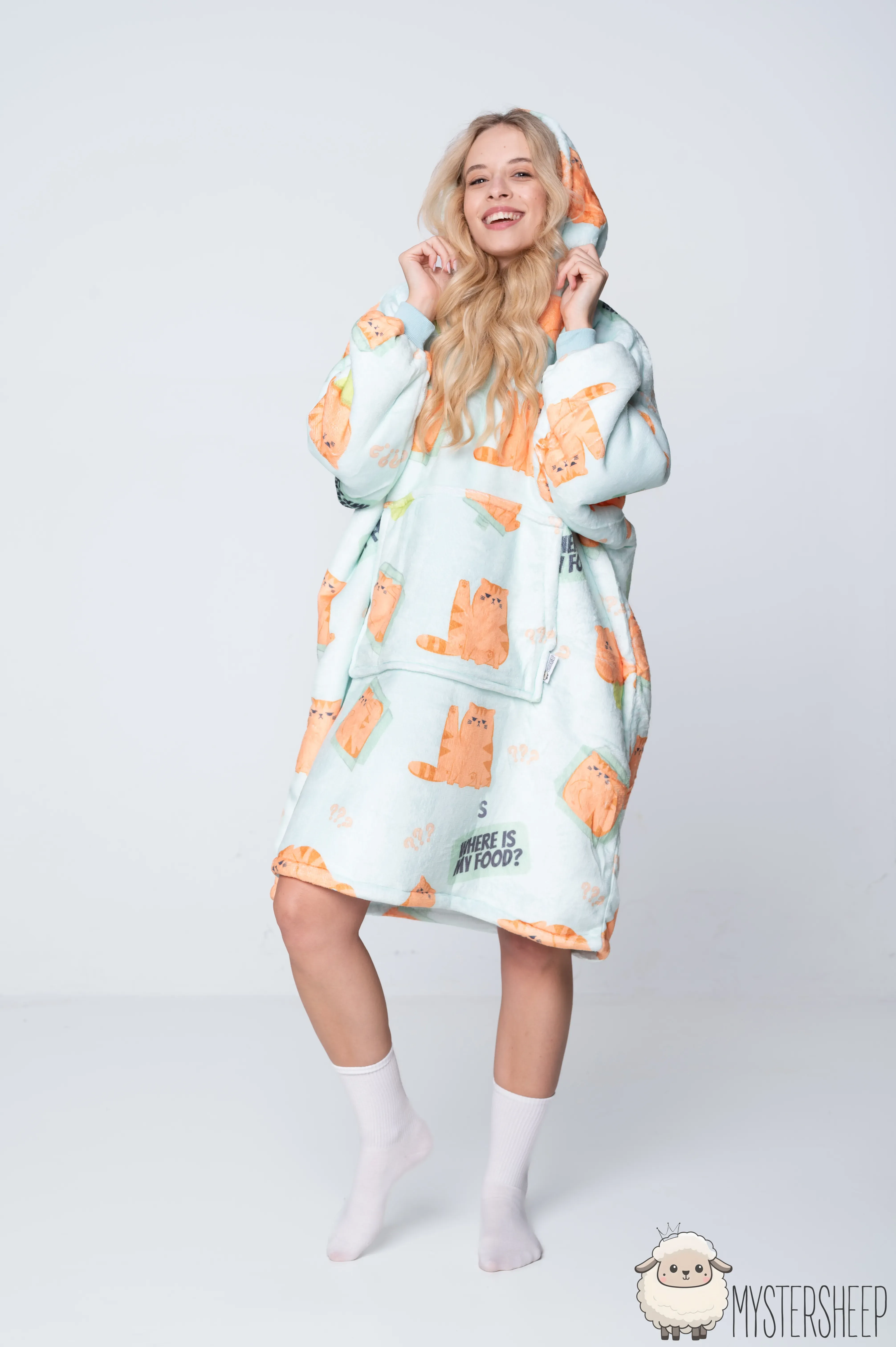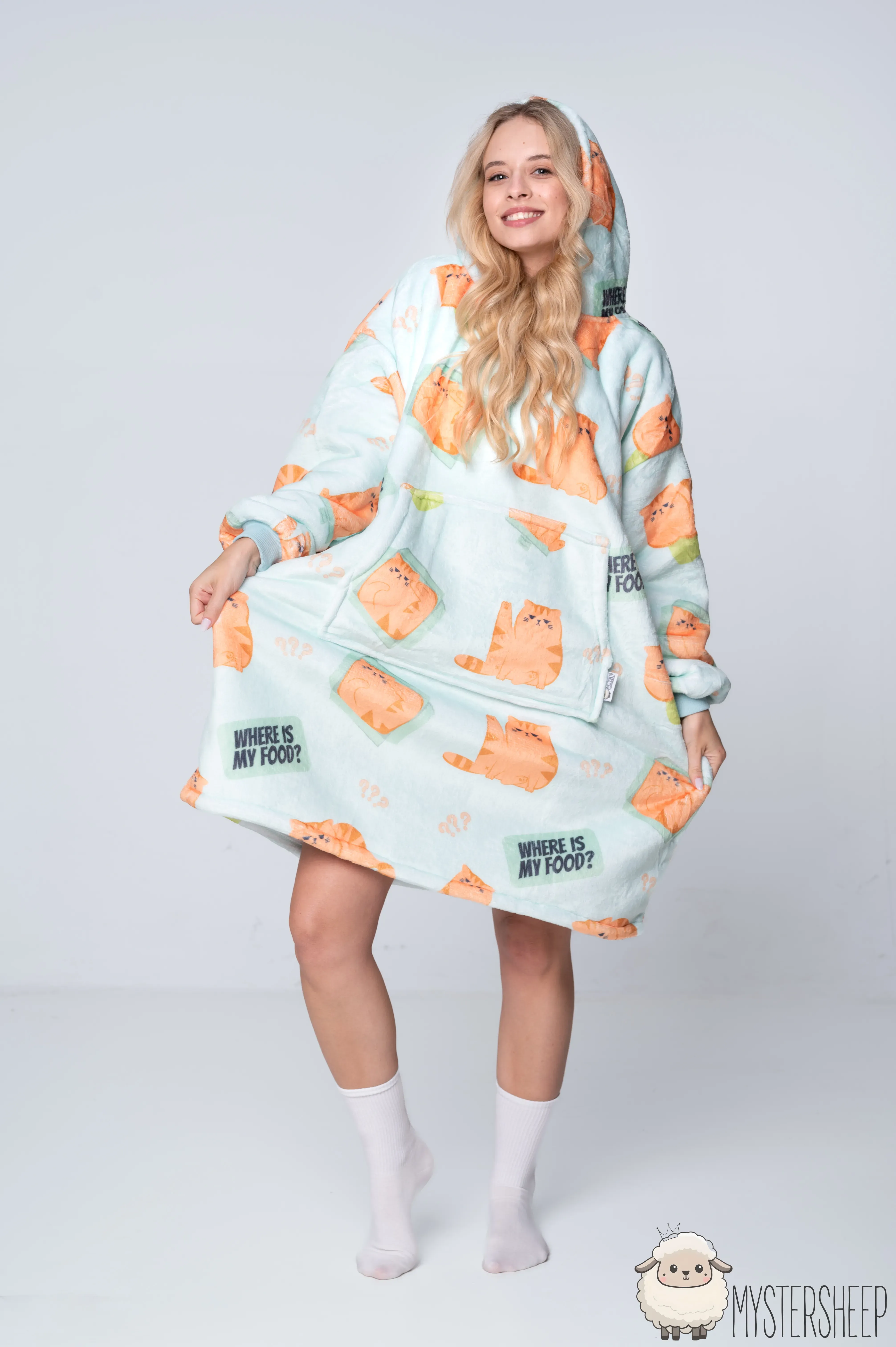 Kocobluza z uroczym wzorem rudych, pulchnych kotków to prawdziwy hit dla wszystkich fanów futrzastych maruderów. Miętowa kocobluza z rozkosznymi kociakami, opatrzonymi hasłem „Where is my food?”, świetnie oddaję klimat lenistwa i domowej błogości. Miękka bluza koc zapewnia przytulność na najwyższym poziomie, a jej oversize'owy krój działa jak ulubiony koc, otulając całe ciało. To idealna koc bluza, dostępna jako kocobluza damska i kocobluza męska dla tych, którzy kochają ciepło, wygodę i… przekąski.