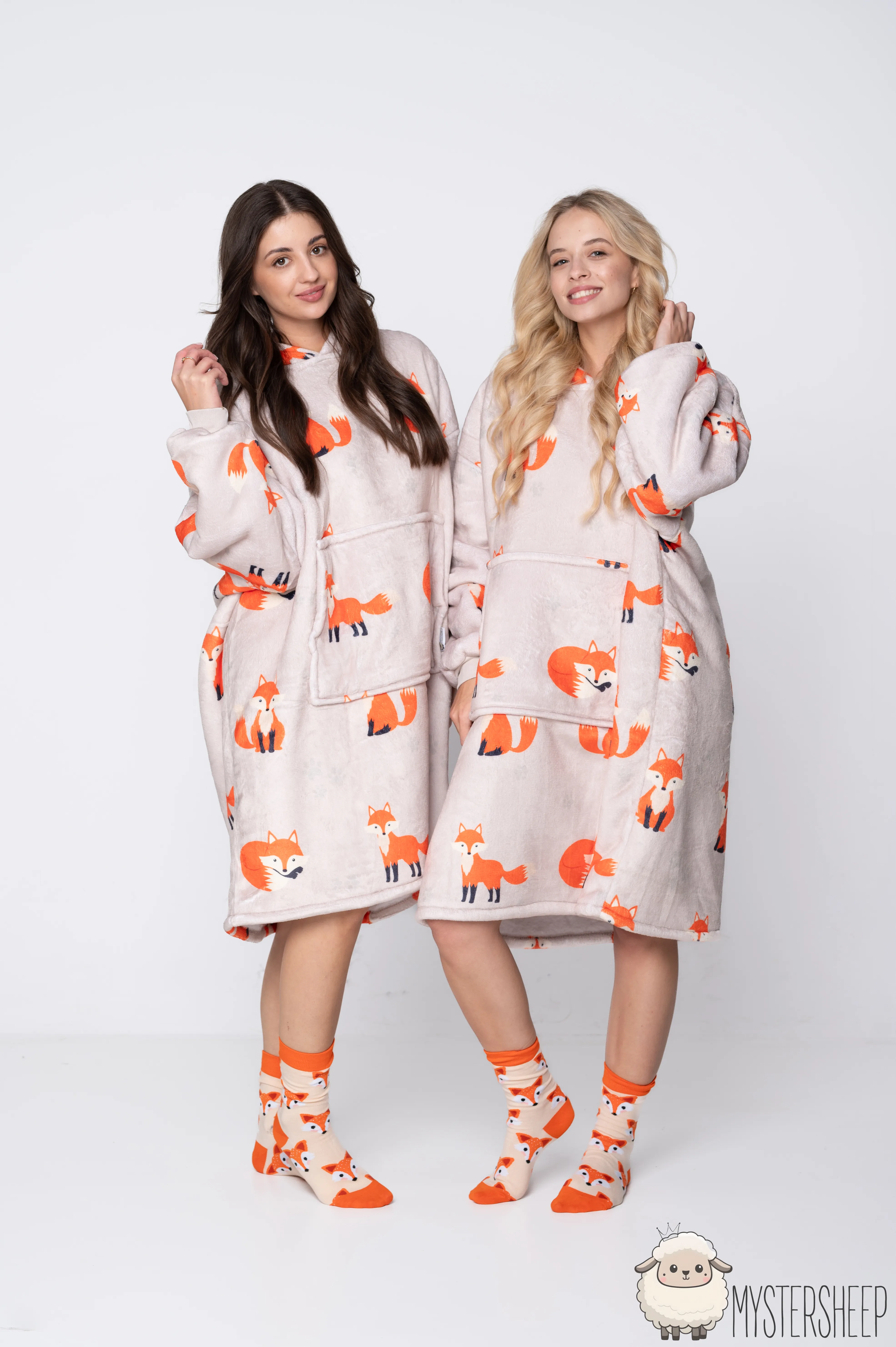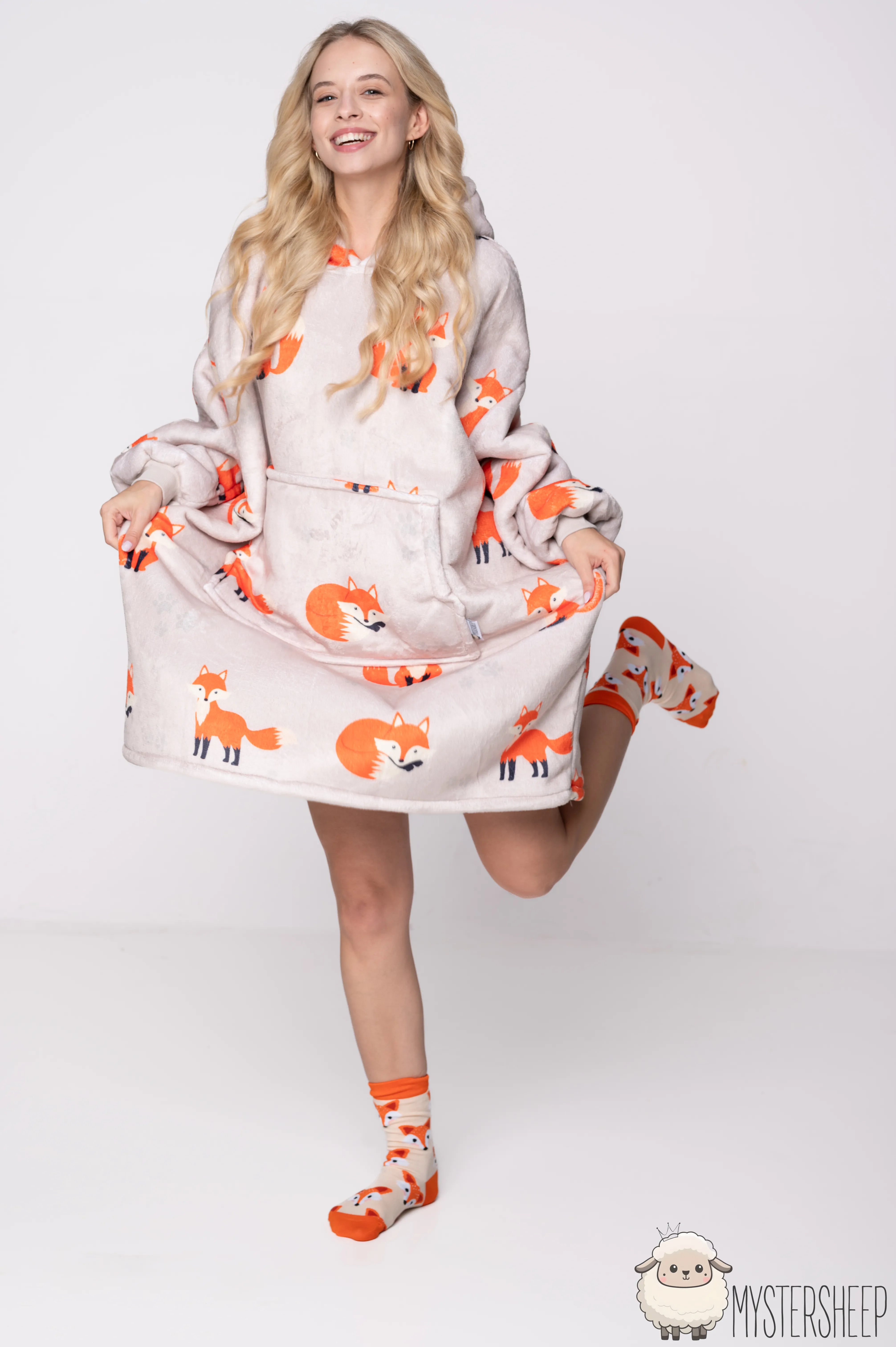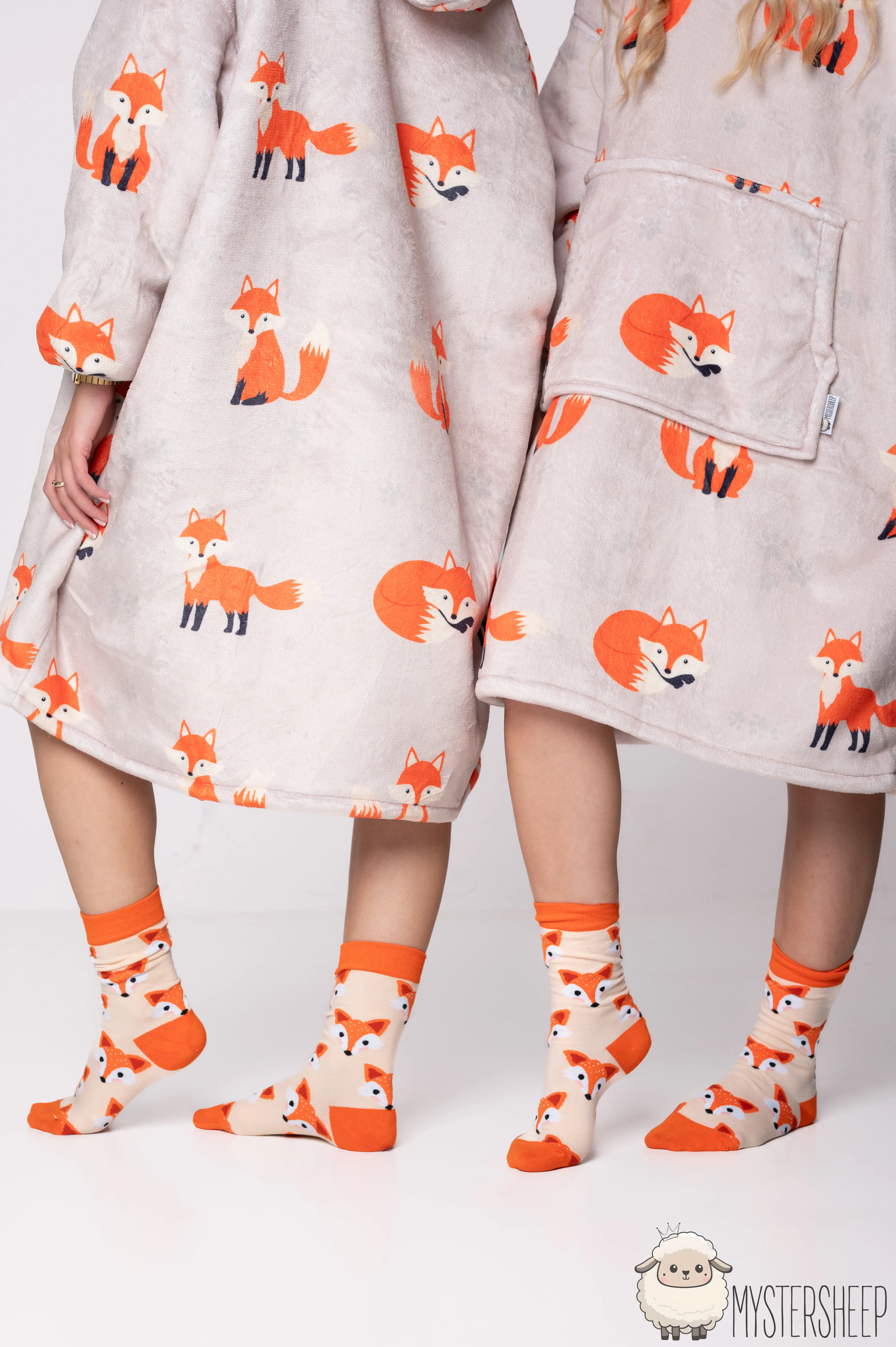 Świetnie dobrana para – lisia kocobluza i skarpetki tworzą zestaw idealny na chłodne dni! Mięciutka, beżowa bluza koc z rudymi lisami rozgrzeje nie tylko ciało, ale i serce. Dzięki swojemu krojowi otula jak koc, zapewniając niezrównany komfort i swobodę. Ta koc bluza dostępna jest jako kocobluza damska i kocobluza męska – i z pewnością poprawi Ci humor, gdy tylko ją założysz.