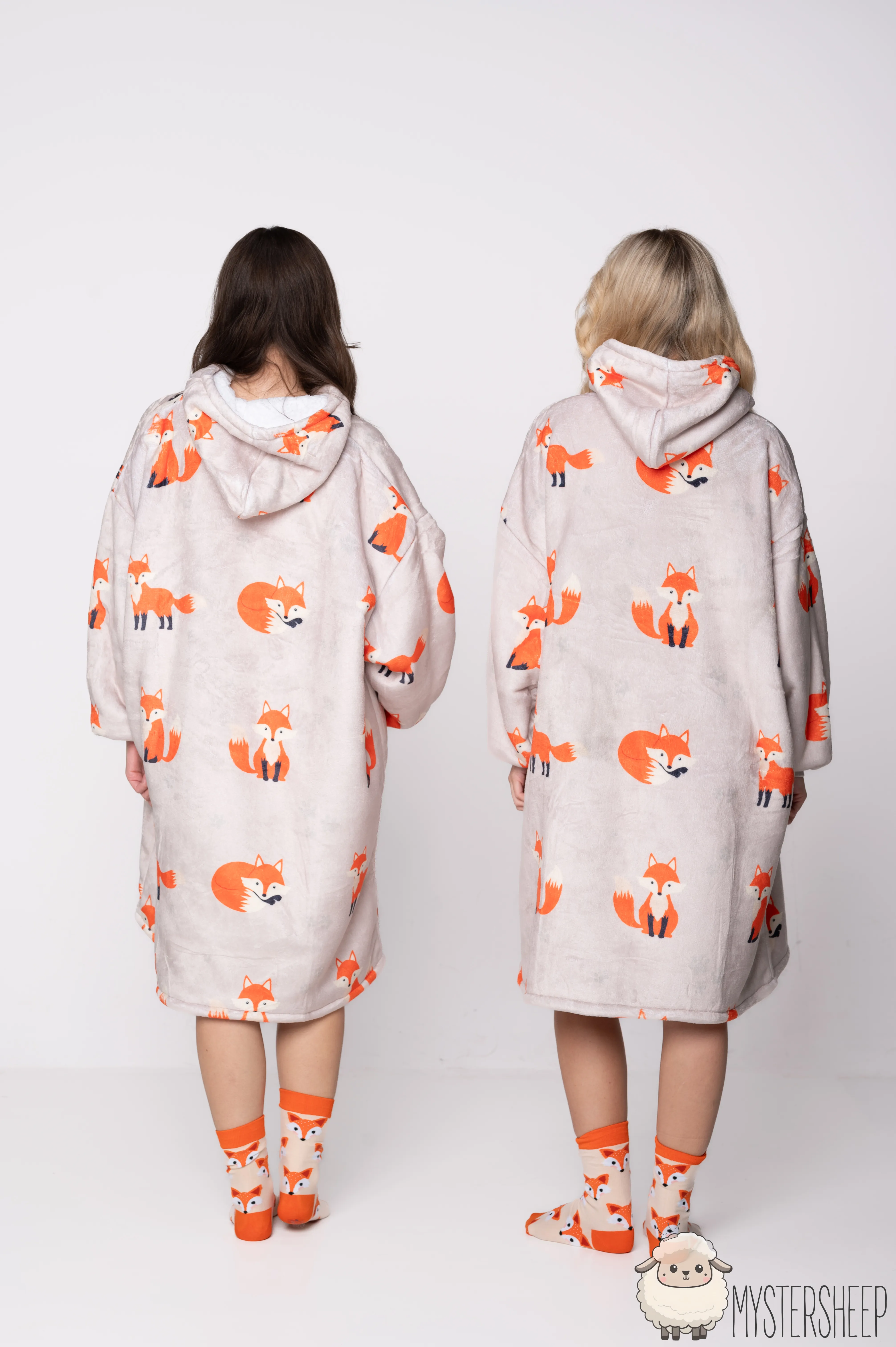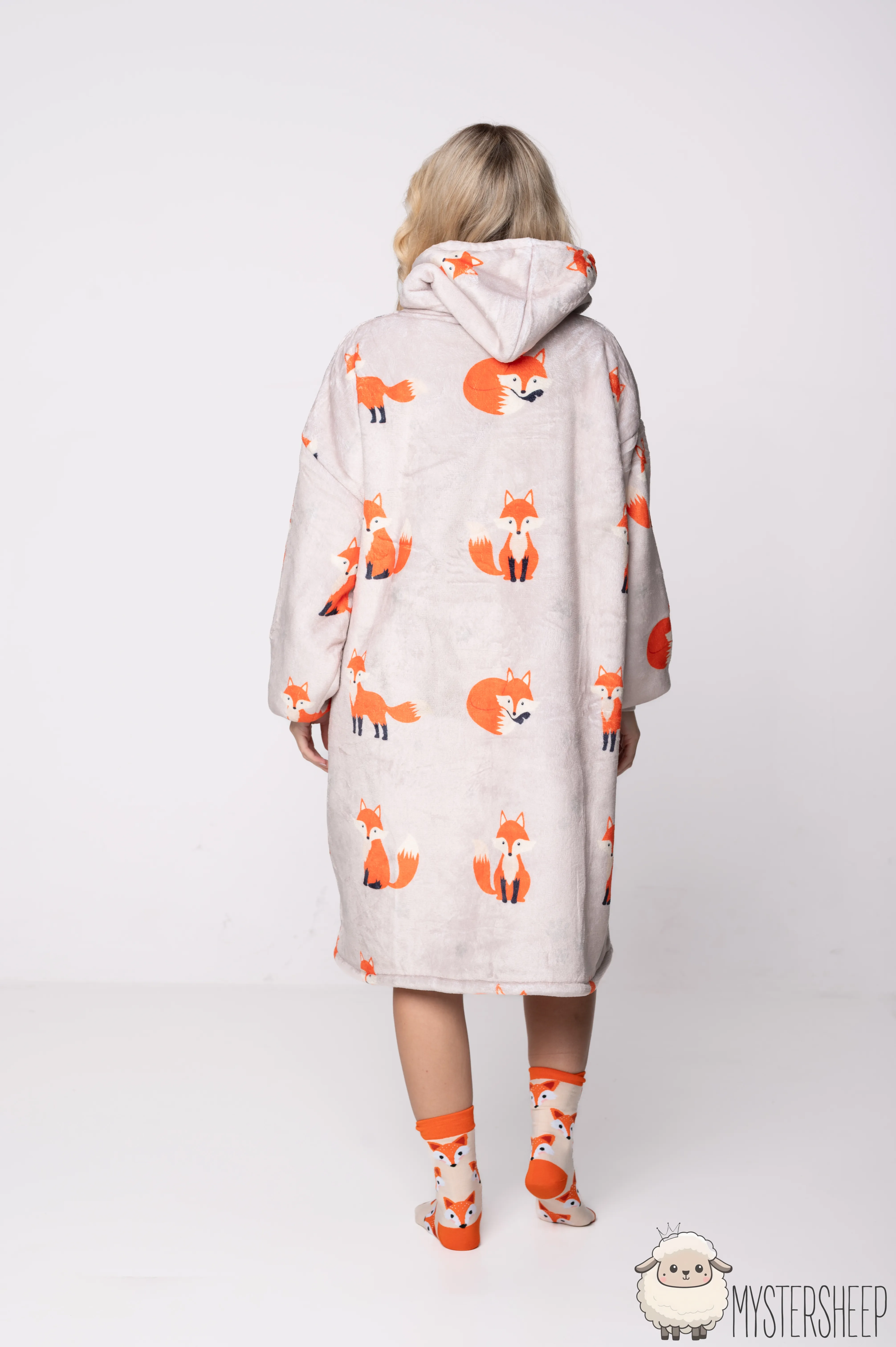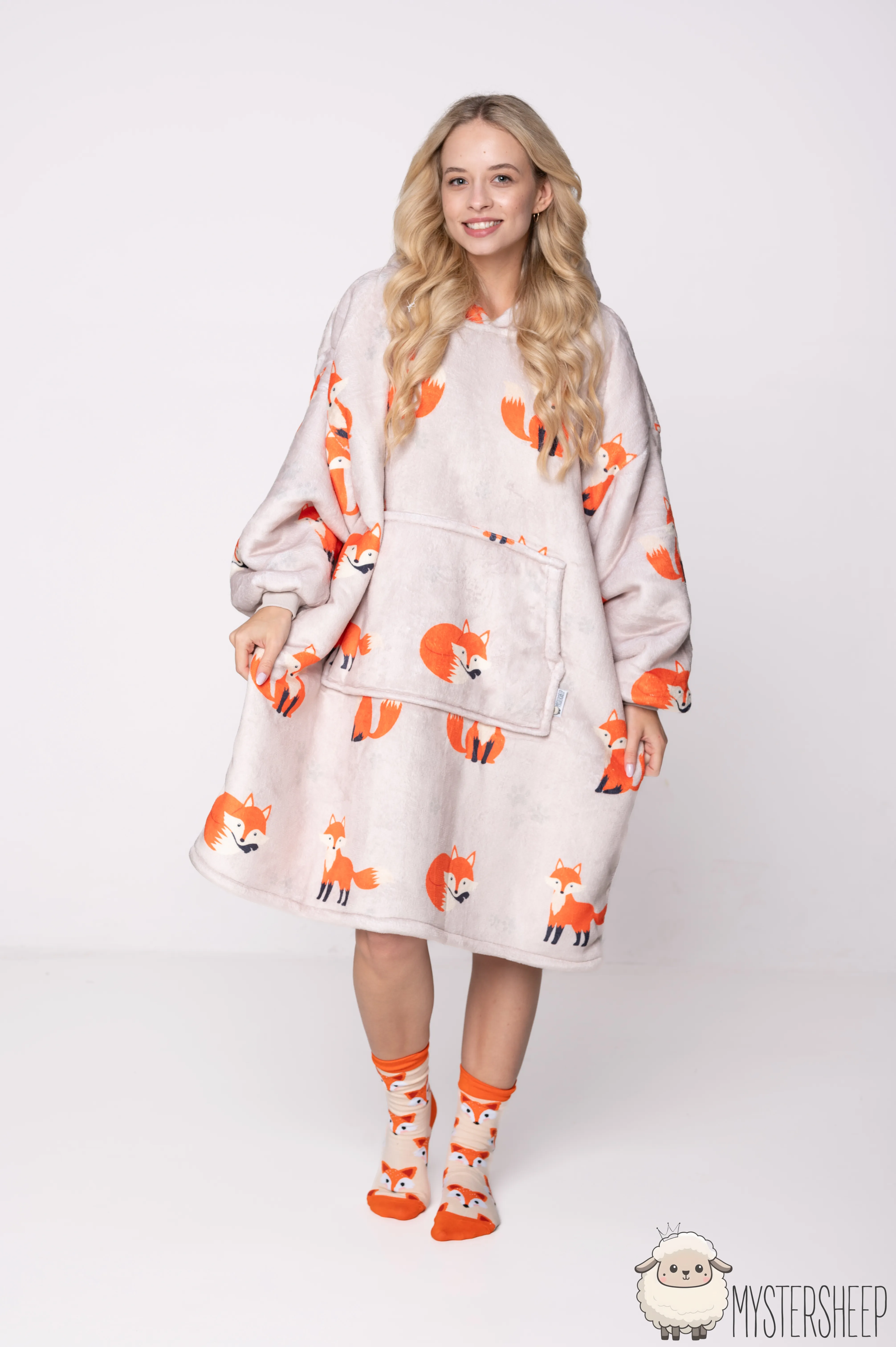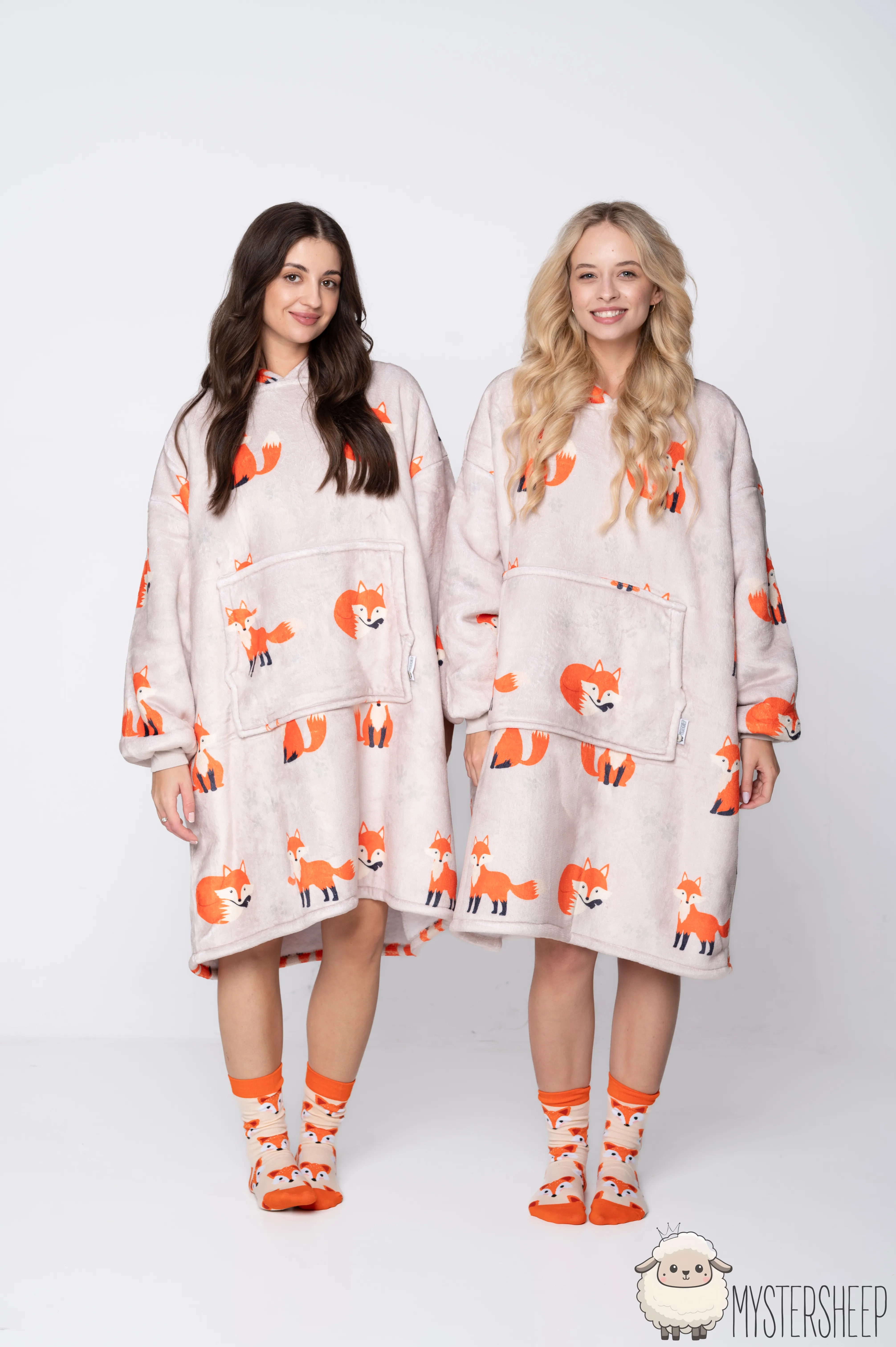 Świetnie dobrana para – lisia kocobluza i skarpetki tworzą zestaw idealny na chłodne dni! Mięciutka, beżowa bluza koc z rudymi lisami rozgrzeje nie tylko ciało, ale i serce. Dzięki swojemu krojowi otula jak koc, zapewniając niezrównany komfort i swobodę. Ta koc bluza dostępna jest jako kocobluza damska i kocobluza męska – i z pewnością poprawi Ci humor, gdy tylko ją założysz.